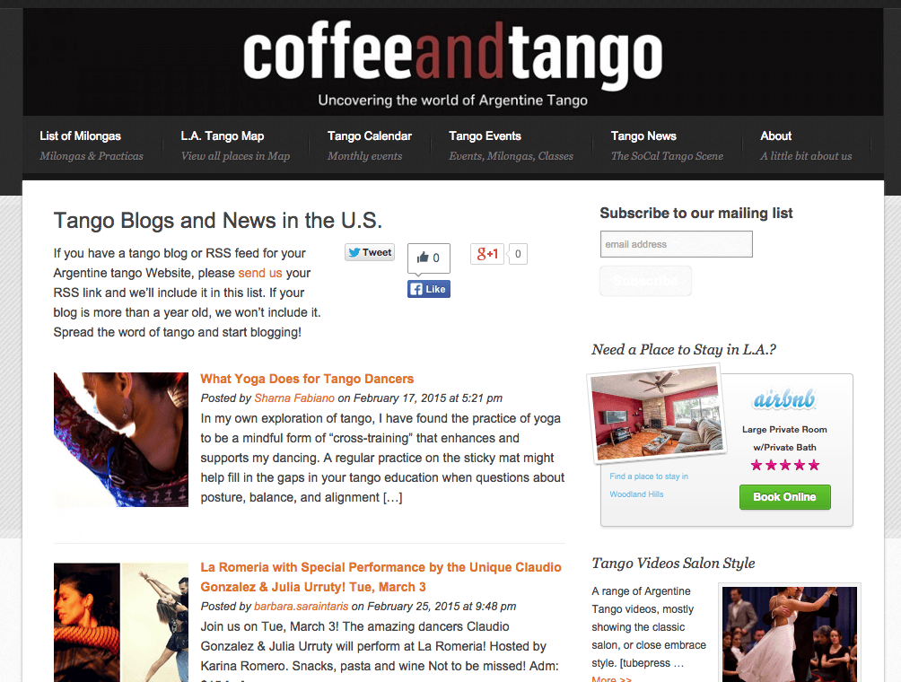 I’ve created a new page that showcases Argentine tango blogs from throughout the United States. It’s a small list at this point, as it’s difficult to find blogs that are updated regularly. The blogs and Websites are a mix of personal insights on tango, to event announcements and advice, among other themes.